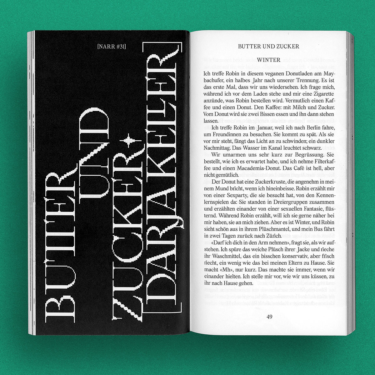 Das Narr #31 brings together texts by FLINTA writers. Prompted by an essay by Isabelle Lehn on the marginalisation of female voices in literature, the open call was directed at women, lesbians, inter, non-binary and trans authors. 106 submissions reached us. We read, discussed, argued—and are now happy to present those texts that stayed with us. As with the writing, all typefaces and illustrations in this issue were created by FLINTA artists. With texts by AX, Karin Bosshard, Nora Brägger, Patricia Büttiker, Jchj V. Dussel, Samira El-Maawi, Asa Hendry, Johanna Hühn, Nesrin Kaya, Darja Keller, Sonja Sophie Kreis, Marie Kublik, Isabelle Lehn, Victoria MacKenzie, Natascha Maier, Theresa Pleitner, Lena Reißner, Rosa Rieck, Gianna Rovere, Roscha A. Säidow and Maë Schwinghammer.